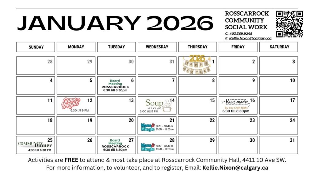 | Join us in out in the neighbourhood in January, there are so many opportunities to come together and connect with your neighbours. Please note that most activities are FREE to participate with all supplies provided, and most activities take place at the Rosscarrock Hall, 4411 10 Ave SW. For more information or to register please email: Kellie.Nixon@calgary.ca |
